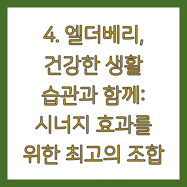 엘더베리는 면역력 강화와 감기 및 독감 예방에 도움을 줄 수 있는 유용한 식품이지만, 만병통치약은 아닙니다. 균형 잡힌 식단, 규칙적인 운동, 충분한 수면 등 건강한 생활 습관을 유지하는 것이 감기 및 독감 예방에 가장 중요합니다.